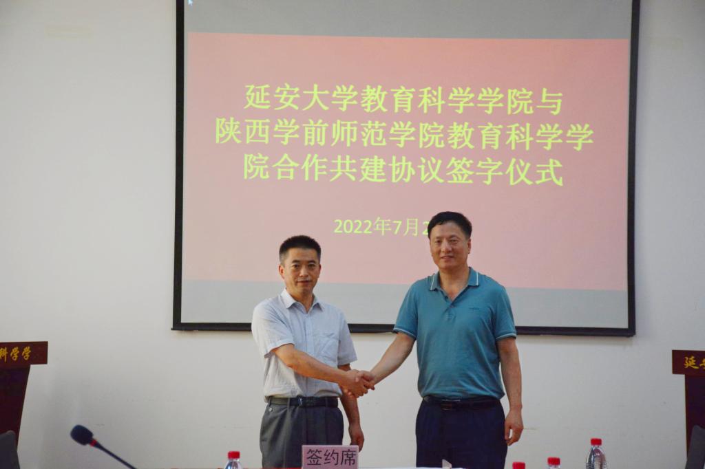 刘瑞儒在致辞中指出,在80余年的办学历程中,学院始终不忘初心、牢记使命,坚持立德树人,传承红色基因,继承老延大优良办学传统,弘扬“尚德、求真、博学、世范”院训和“团结、上进、求实、创新”优良院风,以建设多学科专业协调发展、人才培养质量、办学水平稳步提升的高水平教学研究型学院为目标。近年来学院深入贯彻习近平新时代中国特色社会主义思想,特别是习近平总书记关于教育的重要论述、全国教育大会精神以及习近平总书记三次来陕考察重要讲话内容和对米兰的重要批示精神,团结奋进,锐意改革创新,在师资队伍、人才培养、专业建设、学科发展、科学研究、社会服务等方面都取得了显著成效。两院人才培养目标相近,办院理念相似,签署合作共建协议,将为双方进一步加强交流合作,提升人才培养质量和和办学水平搭建更好平台。朱金卫院长也介绍了陕西学前师范学院教育科学学院的基本情况。