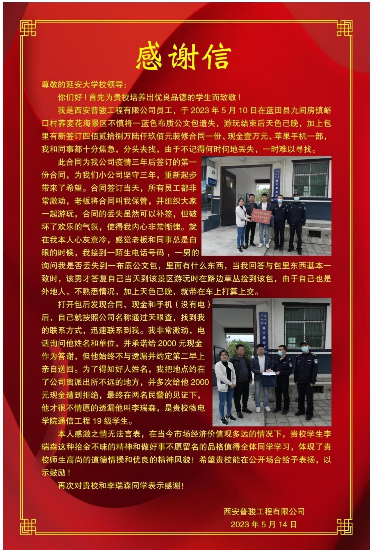 常胜伟在总结讲话中强调指出,一是要重视家庭教育,家庭是人生的第一所学校,家长的一言一行,对孩子树立正确的“三观”至关重要。二是要注重学校教育,系统化的学校教育不仅培养学生学习科学文化知识,对学生健全人格的形成至关重要。三是要注重社会教育。实践是检验真理的唯一标准,学生积极参与社会体验和实践,对将来走上工作岗位,适应社会发展,为国家建设发展贡献力量至关重要。他希望李瑞森同学戒骄戒躁,继续发扬中华民族传统美德,用实际行动践行延安精神,并号召全院学生向李瑞森学习,践行社会主义核心价值观,培养高尚的道德情操,不负韶华、砥砺奋进,努力做一个名副其实的具有延安精神特质的时代新人。