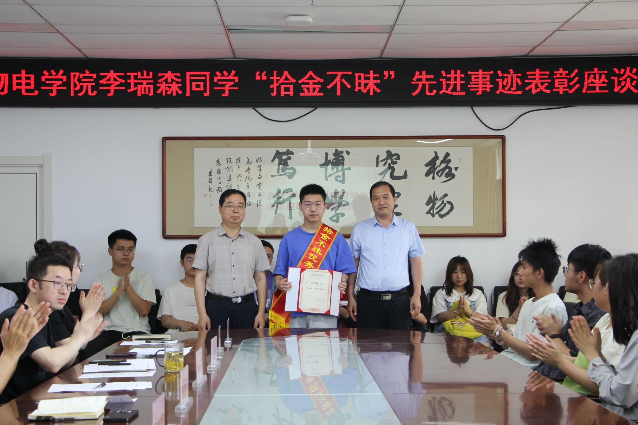 本网讯 6月21日上午,物电学院在新城校区信息大厦A607会议室举行李瑞森同学“拾金不昧”先进事迹表彰座谈会。院党委书记常胜伟,院长张富春,党委副书记肖金学,全体辅导员及各班党团骨干、积极分子、学生代表共60余人参加了座谈会。