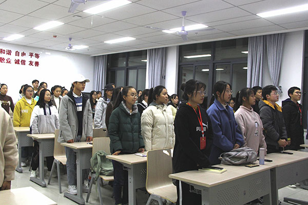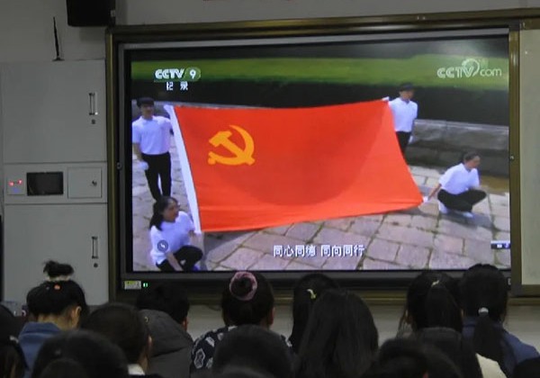 会议分为三项,第一项为全体奏唱《国际歌》;第二项为观看纪录片《辉煌中国》,同学们认真观影,现场秩序井然;第三项会议为分享观影感悟。