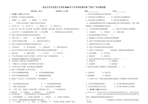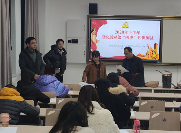 为加强学院对拟发展对象的培养、教育及考察工作,切实保证发展党员质量,让同学们对党史、新中国史、改革开放史、社会主义发展史有更深刻的认知并更好地坚持和发展中国特色社会主义。依据《中国共产党发展党员工作细则》的相关要求和学院党建工作实际,2020年11月30日下午,我院学生党支部于学院202教室组织进行2020年下半年拟发展对象“四史”知识测试。